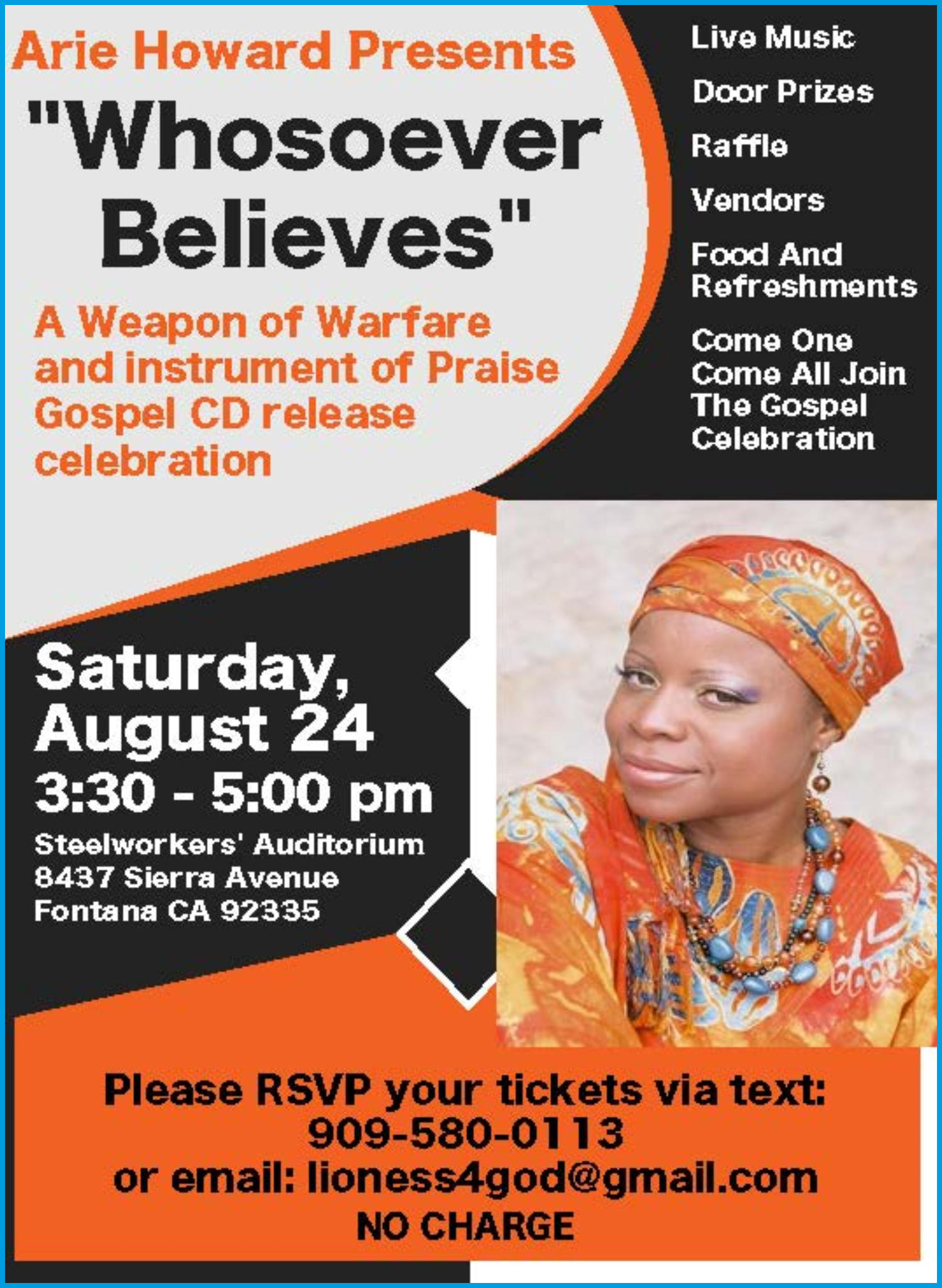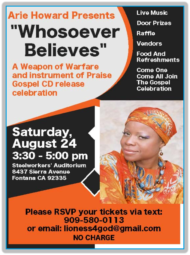 Aug. 24, 2019 (Sat) - Ms. Arie Howard CD Release Celebration @ Steelworkers' Auditorium,